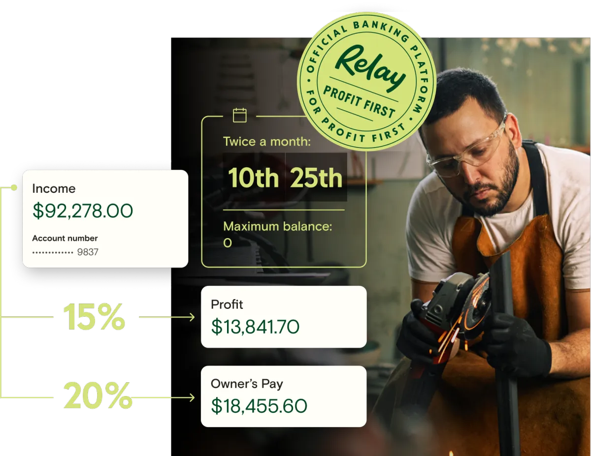 As the official banking platform for Profit First Professionals, Relay keeps you on track with the Profit First method. Open accounts in seconds, set up auto-transfer rules and put allocations on autopilot.
